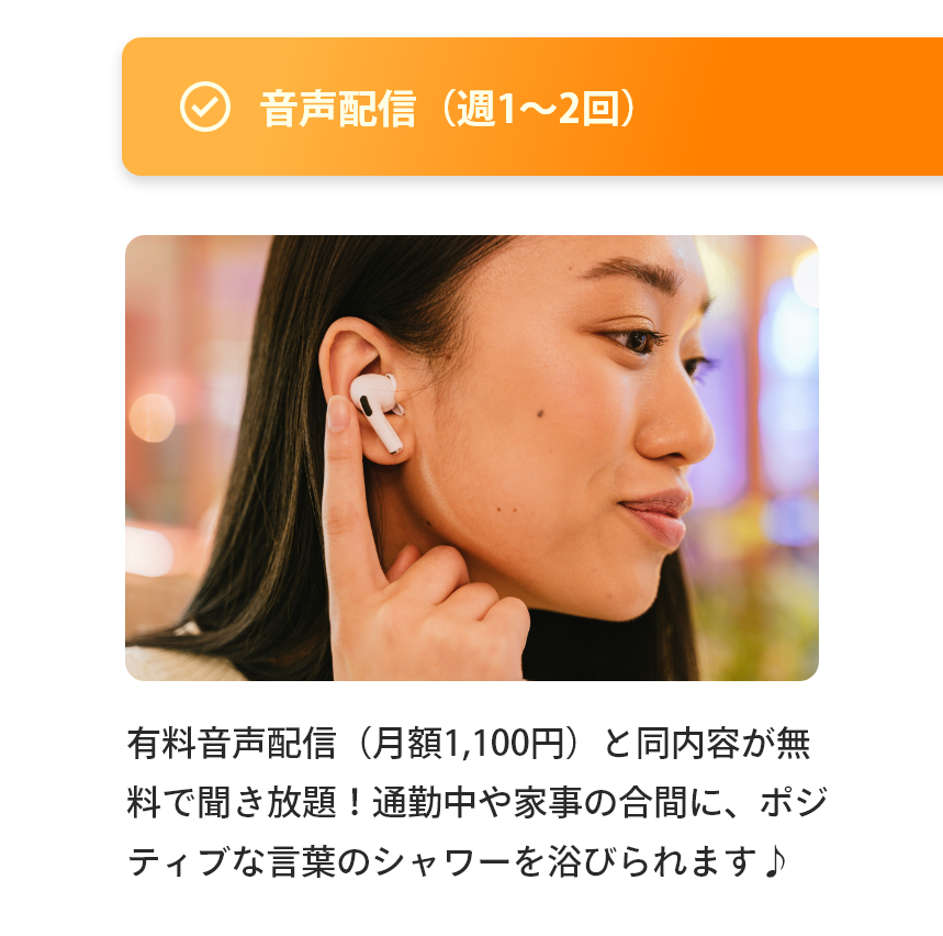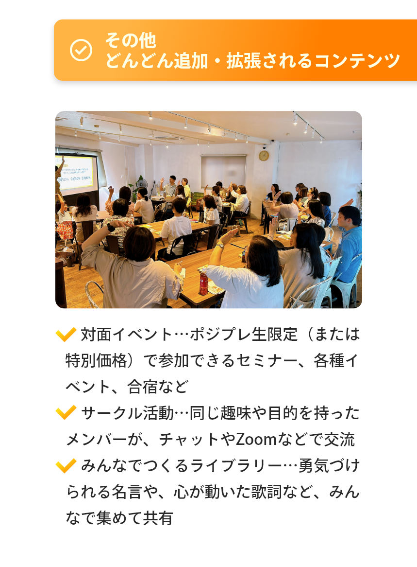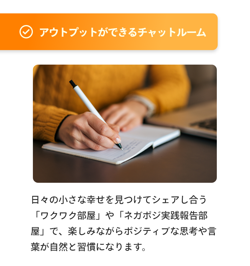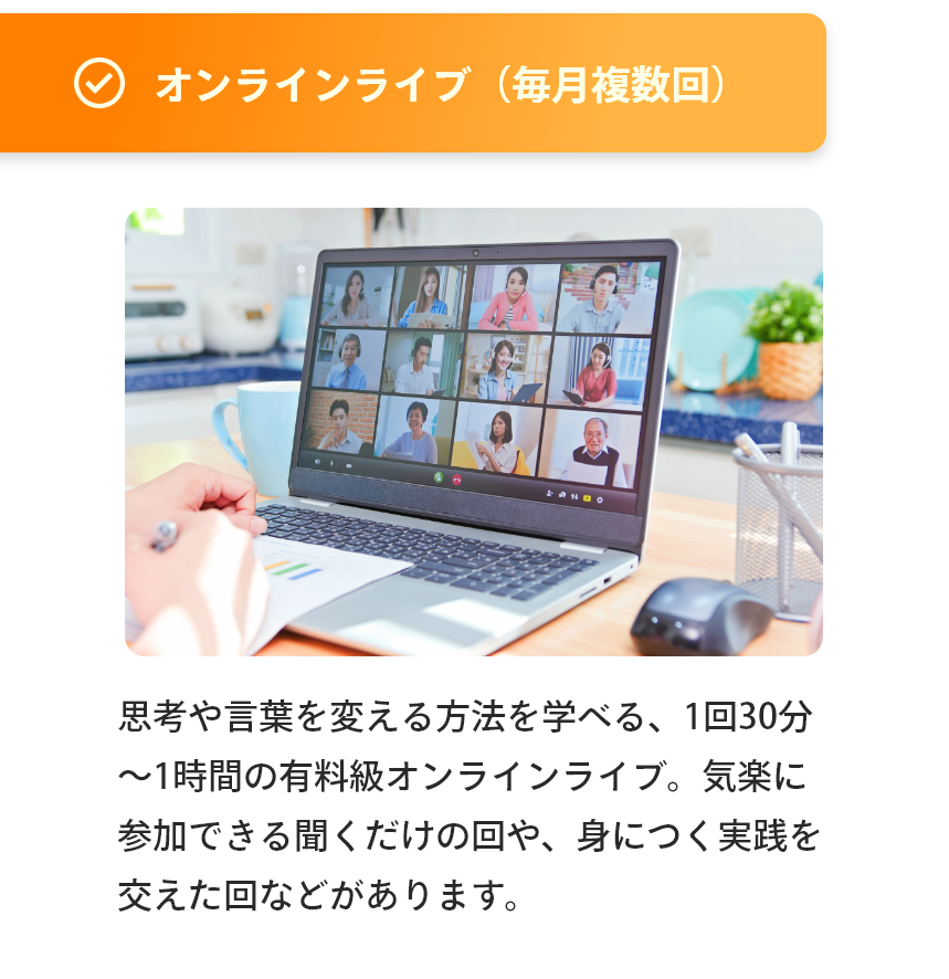 毎月複数回の実践型ライブや、日常的に交流できるDiscordという無料のチャットアプリを通じて、前向きな思考と言葉を育てていく場です。「自分に自信を持ちたい」「もっとポジティブになりたい」「自分らしく話せるようになりたい」そんな方にぴったりの場所です。